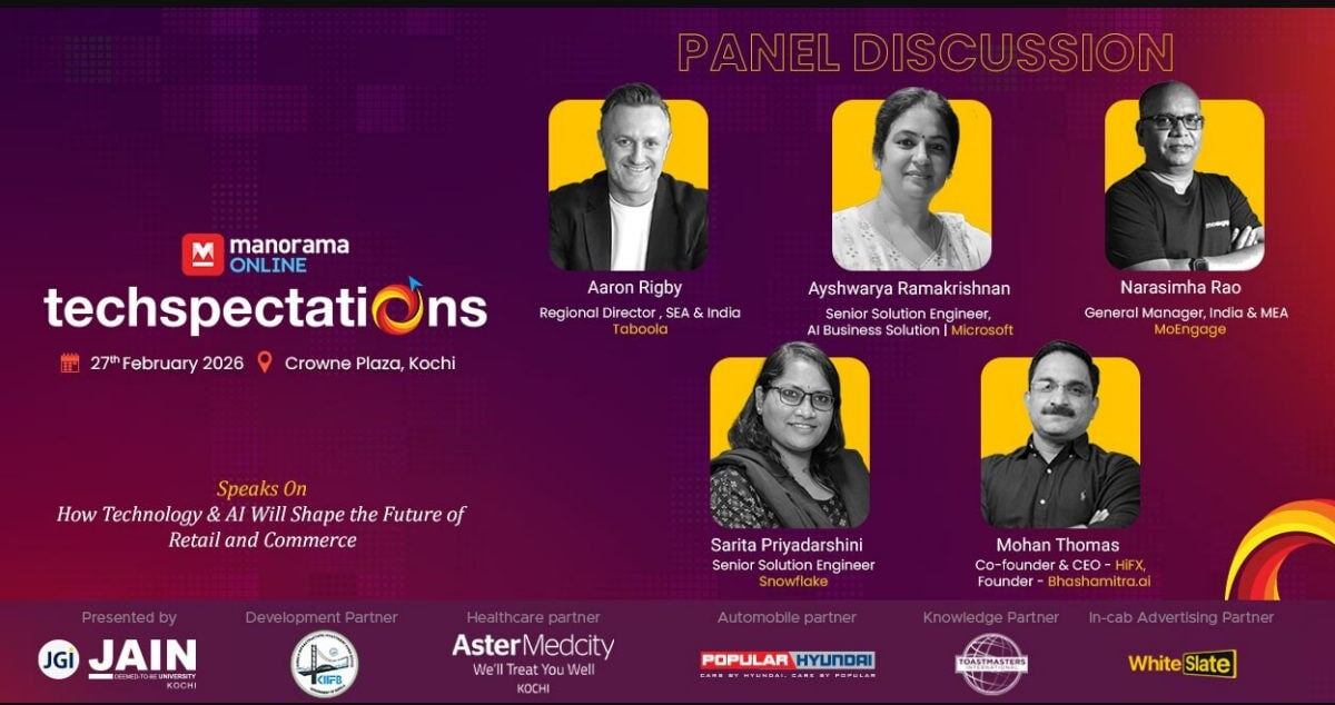 സാങ്കേതികവിദ്യയുടെ കരുത്തിൽ കുതിക്കാൻ മനോരമ ഓൺലൈൻ ‘ടെക്സ്പെക്റ്റേഷൻസ് 2026’ ഡിജിറ്റൽ സംഗമം. കൊച്ചി ക്രൗൺ പ്ലാസയിൽ നടക്കുന്ന ഉച്ചകോടിയിൽ സാങ്കേതികവിദ്യ, വാണിജ്യം, ആരോഗ്യം, മാധ്യമം, വിനോദം എന്നീ മേഖലകളിലെ വിദഗ്ധർ പങ്കെടുക്കും. ജെയിൻ യൂണിവേഴ്സിറ്റിയുടെ സഹകരണത്തോടെ ‘ക്രിസ്റ്റൽ ബോളിങ് 2030’ എന്ന പ്രമേയത്തിലാണ് ഉച്ചകോടി സംഘടിപ്പിക്കുന്നത്. സാങ്കേതികവിദ്യയും ആർട്ടിഫിഷ്യൽ ഇന്റലിജൻസും റീട്ടെയിൽ-വാണിജ്യ മേഖലകളുടെ ഭാവി എങ്ങനെ രൂപപ്പെടുത്തുമെന്ന വിഷയത്തിൽ നടക്കുന്ന പാനൽ ചർച്ചയിൽ പ്രമുഖരായ അഞ്ച് വിദഗ്ധർ പങ്കെടുക്കുന്നു.