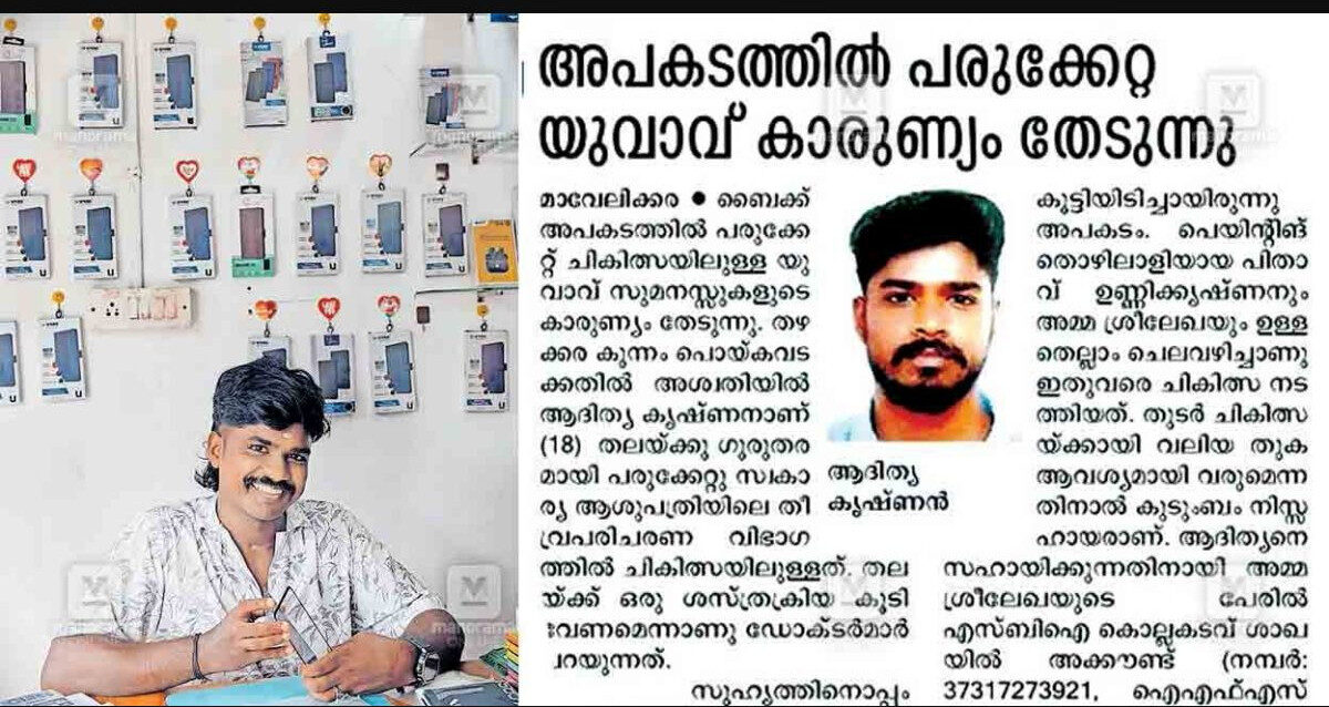 വാർത്തയെ തുടർന്നു സുമനസ്സുകൾ നൽകിയ തുകയും നാട്ടുകാരുടെയും ബന്ധുക്കളുടെയും സഹായവും ആണു ആദിത്യനു ജീവിതത്തിലേക്കു തിരികെ വരാൻ തുണയായത്. ചങ്ങനാശേരിയിലെ സ്വകാര്യ സ്ഥാപനത്തിൽ മൊബൈൽ ടെക്നിഷ്യൻ കോഴ്സ് പഠിക്കുമ്പോഴായിരുന്നു അപകടം. അപകടത്തെ തുടർന്നു ഒരു വർഷത്തോളം കിടപ്പിലായ ആദിത്യനെ പിന്നീട് പിതാവാണ് ദിവസവും ചങ്ങനാശേരിയിൽ എത്തിച്ചിരുന്നത്. പിന്നീട് തനിയെ ബസ് കയറി പോകാൻ തുടങ്ങി. പഠനം പൂർത്തിയാക്കിയ ആദിത്യൻ സ്വന്തം മൊബൈൽ റിപ്പയറിങ് കേന്ദ്രം ആരംഭിക്കുന്നതിനു ബാങ്ക് വായ്പയ്ക്കായി ശ്രമിച്ചു.